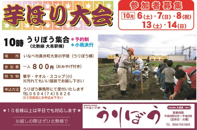 北勢線大泉駅横、ふれあいの駅うりぼうでは、毎年好評の芋ほり大会を今年も10月6日(土)から開催。